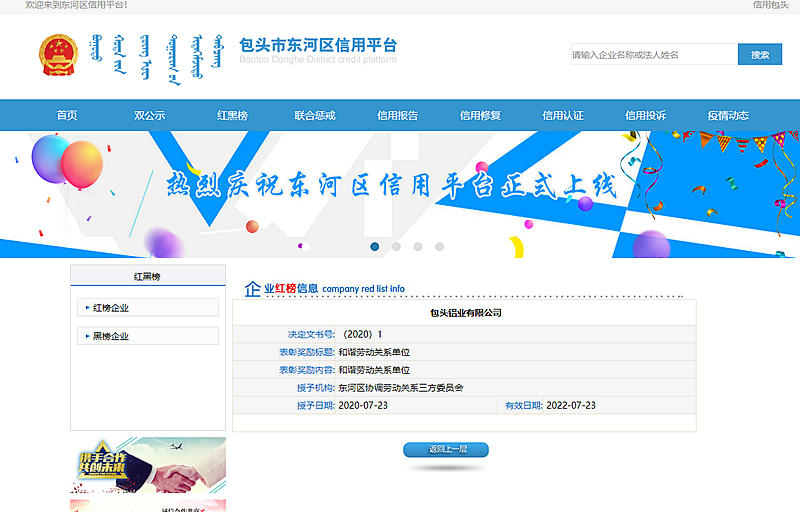 和諧勞動(dòng)關(guān)系單位的審核,被列入包頭市東河區(qū)信用平臺(tái)紅榜名單,同時(shí)逐級(jí)申報(bào)信用中國(guó)(內(nèi)蒙古)和信用中國(guó)(包頭)的誠(chéng)信企業(yè)。